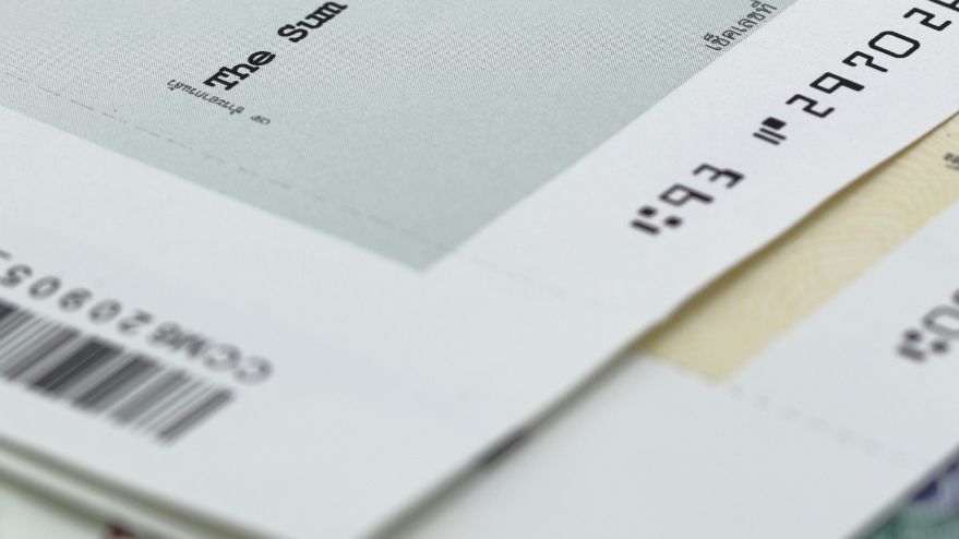 A green line can be seen extending from top-middle of the screen all the way to the bottom-middle of the screen. The line is over the cheque in the center. The large cheque then splits into two smaller cheques. One cheque moves to the middle left side of the screen and other cheque moves to the middle right side of the screen.