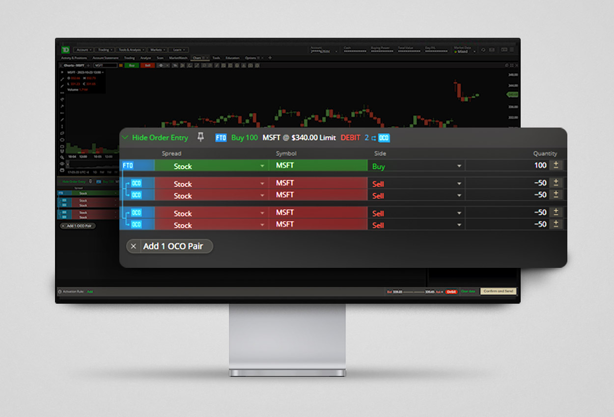 Other advanced trading strategies available in Active Trader include One Cancels Other (OCO), First Triggers One Cancels Other (FTO), First Triggers Sequence (FTS) and First Triggers All (FTA) orders, with the ability to create up to eight linked orders.