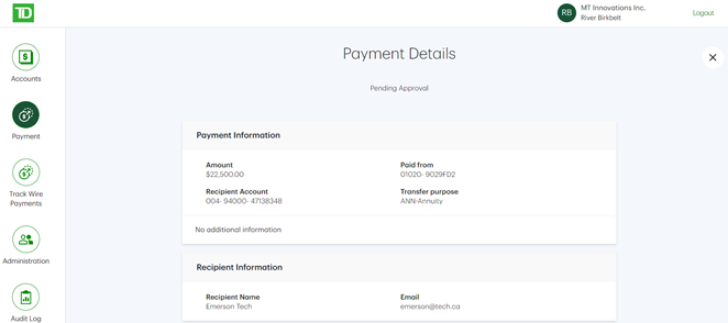- Suivez votre paiement par virement interbancaire de sa création à la TD à sa destination (date/heure du crédit dans le compte du destinataire).